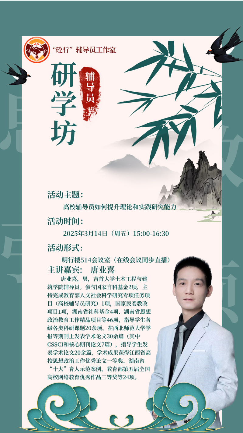 活动特邀吉首大学辅导员唐业喜老师进行了题为“高校辅导员如何提升理论和实践研究能力”的专题讲座。唐老师详细阐述了辅导员理论研究的相关方法,包括如何选定研究课题、如何运用科学的研究方法进行数据分析等。此外,唐老师结合自己申报课题的案例,分享了将理论研究成果有效转化为实践应用的策略,还就辅导员学术论文的投稿与发表提出了宝贵经验。