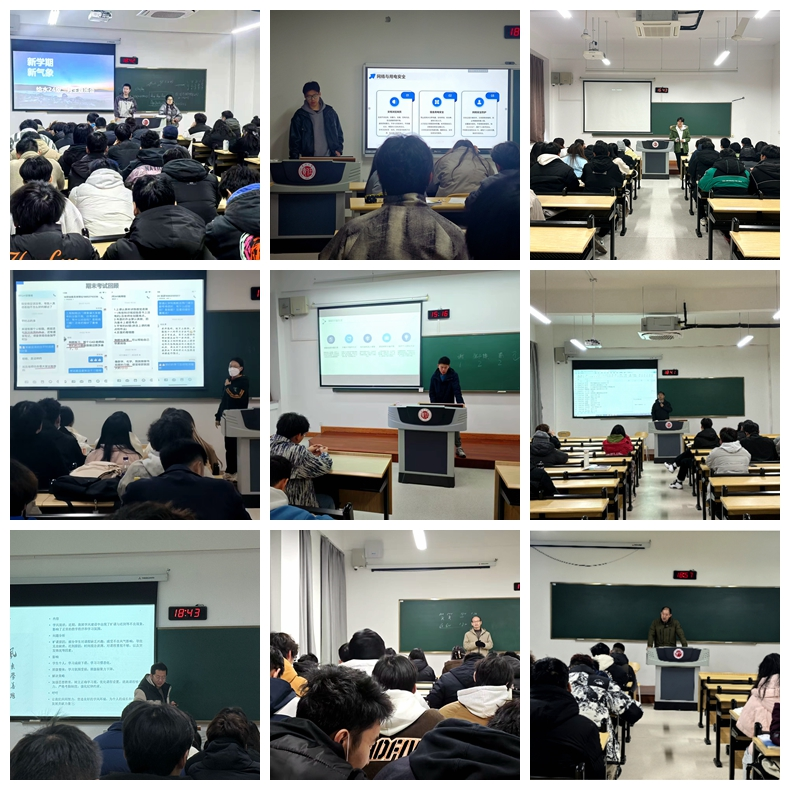 23级9个班级召开本学期第一次班会,各班会邀请到班主任杨磊、王勤、伍君勇等老师、辅导员李欣一参加。班会围绕学情分析、安全教育、新学期展望依次展开,全班同学认真参与,现场秩序井然。各班级结合上学期期末考试成绩分析,从挂科率、四六级通过率等数据进行了全面总结与深入剖析,明确指出学科存在的问题,并提出了针对性的学习方向与方法建议。随后,各班主任结合班风现状,鼓励同学尽早规划人生方向,针对同学们的考研、就业等困惑,一一指明学习路径。接着,班会采用案例分析与播放警示视频相结合的方式,全面覆盖人身、财产、网络等安全领域,引导同学们增强安全防范意识,提升风险识别能力,有效规避潜在的安全风险。