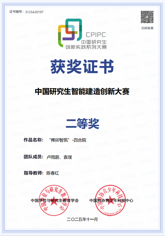 2025年11月30日,首届中国研究生智能建造创新大赛在南通国际会议中心圆满落幕。由华体会-华体会app-华体会体育官网 研究生卢雨蔚担任项目负责人,队员袁璞协同参与,陈春红老师担任指导教师的团队,凭借作品《榫卯智筑-四合院》在决赛中表现优异,荣获全国二等奖,展现了学院在智能建造领域的创新实力与人才培养成果。